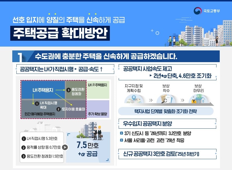 공공과 민간의 역할 변화: LH(한국토지주택공사)가 공공택지를 민간에 매각하지 않고 직접 개발에 나서며 공급 속도를 높이고, 동시에 민간 재건축·재개발 사업의 걸림돌을 제거해 양측의 시너지를 극대화하는 방안이 포함되었습니다.