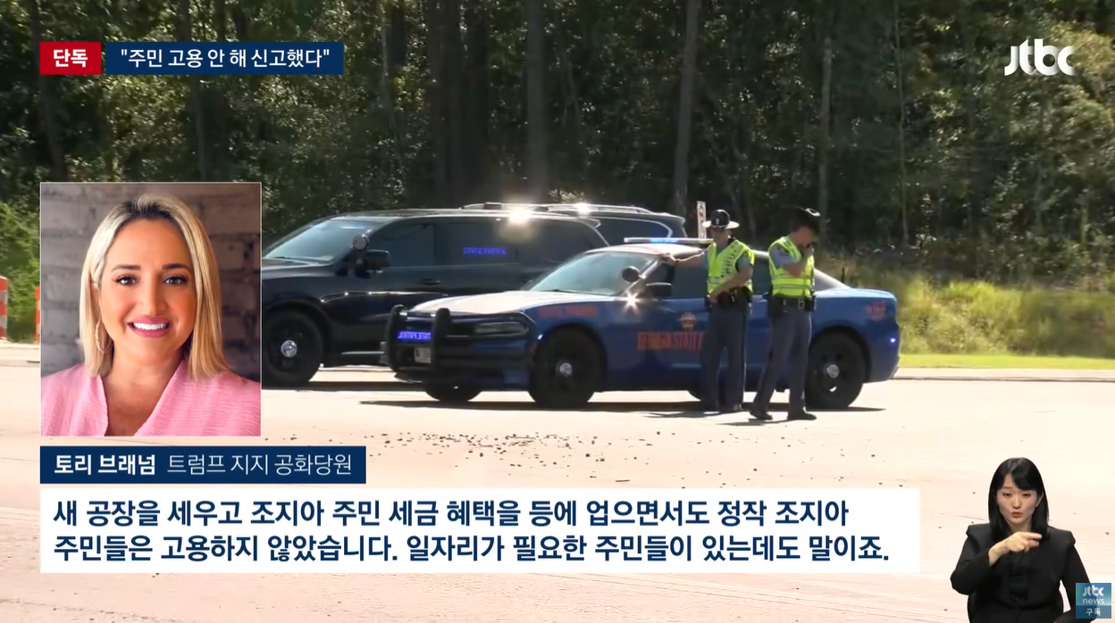 정치인의 고발: 토리 브레넘은 "내가 공장을 신고했다"고 당당히 밝히며, 그 이유에 대해 "한국 기업은 지역 경제에 이득이 되지 않기 때문"이라고 설명했습니다. 그는 한국 기업이 막대한 세금 혜택을 받으면서도 현지인을 고용하지 않고, 한국인 인력을 데려와 기만적인 행위를 하고 있다고 비난했습니다.