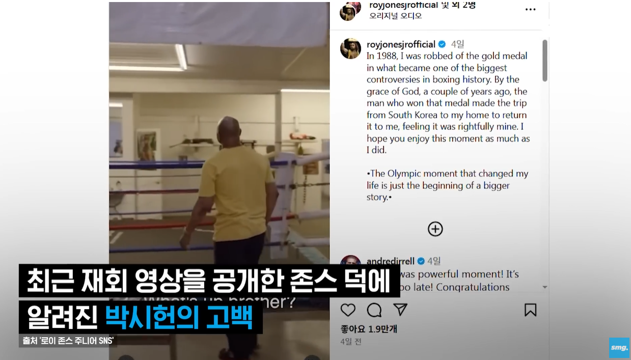 감동의 순간: 박시헌 선수는 로이 존스 주니어의 고향인 미국 플로리다주 펜서콜라의 한 체육관을 찾아갔습니다. 그리고 로이 존스 주니어에게 1988년 서울 올림픽에서 받은 금메달을 건넸습니다.