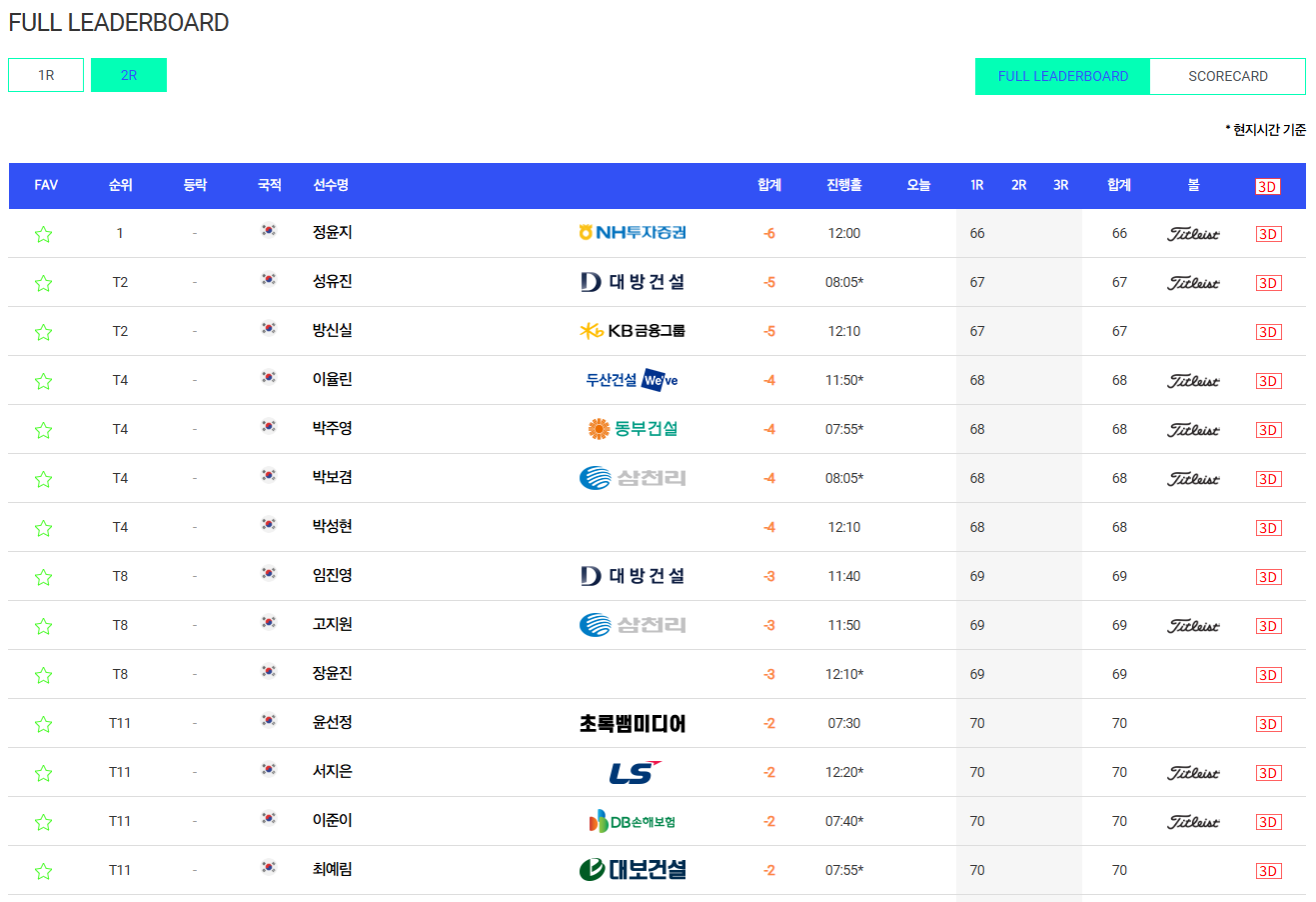 '버디만 6개'의 완벽한 경기: 정윤지 선수는 1라운드 내내 보기 없이 버디만 6개를 잡는 완벽한 플레이를 선보이며, 6언더파 66타를 기록, 단독 선두 자리에 올랐습니다. 특히 어떤 특정 샷이 잘 맞았다기보다는, 전체적인 샷과 퍼팅의 조화가 좋았다는 그녀의 소감은, 그만큼 안정적인 경기 운영 능력을 보여주는 대목입니다.
