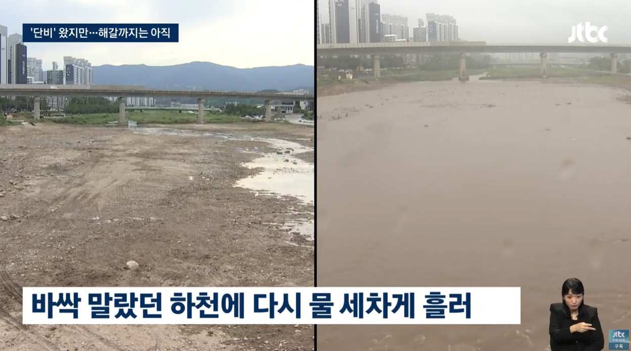 살아난 '남대천': 가뭄으로 바닥을 드러내 걸어 다닐 수 있을 정도였던 강릉의 남대천에도 다시 물이 흐르기 시작했습니다. 한때 메말랐던 강의 모습은 사라지고, 다시금 힘차게 흐르는 물줄기는 주민들에게 큰 위로가 되었습니다.