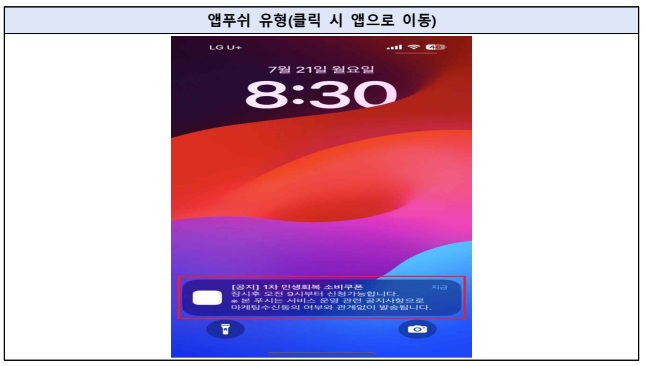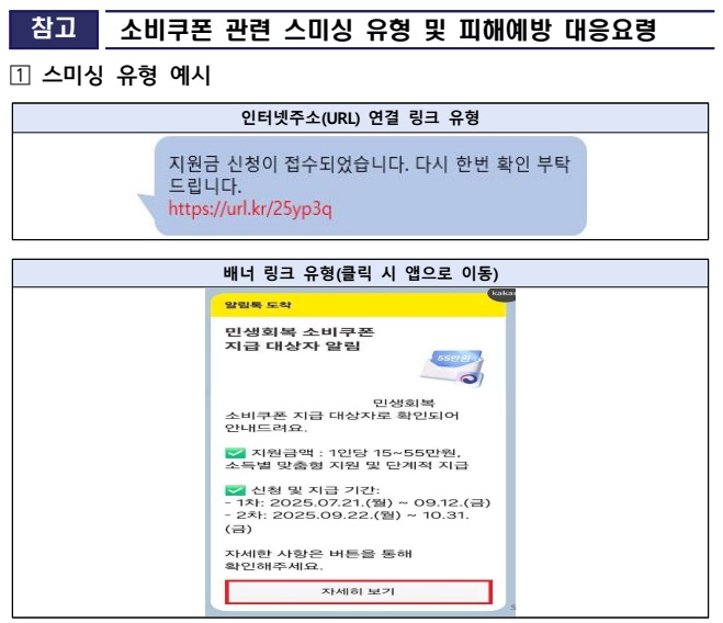 "2차 민생회복 소비쿠폰과 관련하여 정부 및 카드사 등은 인터넷 주소 바로가기(URL)가 포함된 문자 및 SNS 안내를 절대로 발송하지 않습니다."