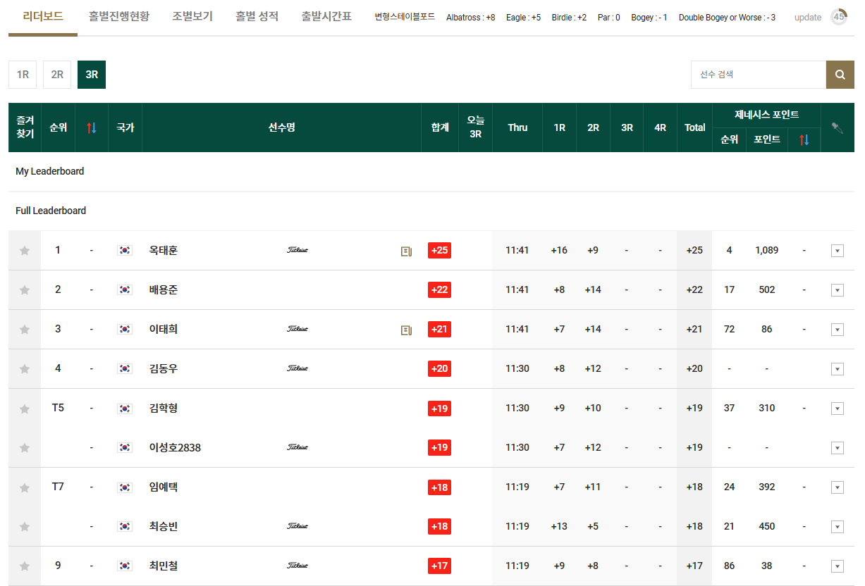 - 옥태훈: 이글 1개, 버디 3개, 보기 2개를 기록하며 2라운드에서 9점을 추가, 총 25점으로 단독 1위를 유지했습니다.