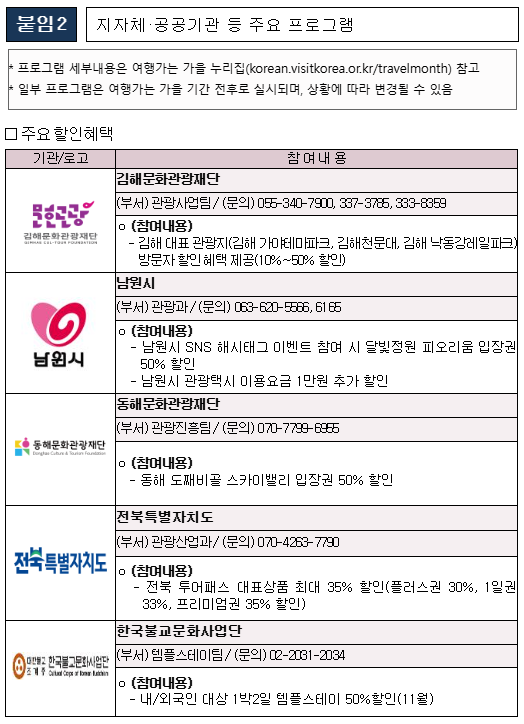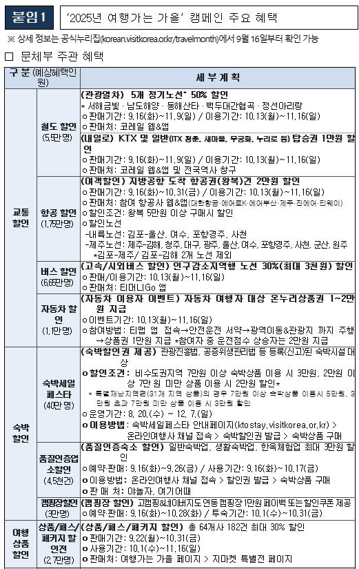 - 공식 누리집 확인: 모든 할인 혜택의 구매 방법, 이용 기간, 판매처 등 자세한 정보는 '여행가는 가을' 공식 누리집에서 확인할 수 있습니다.