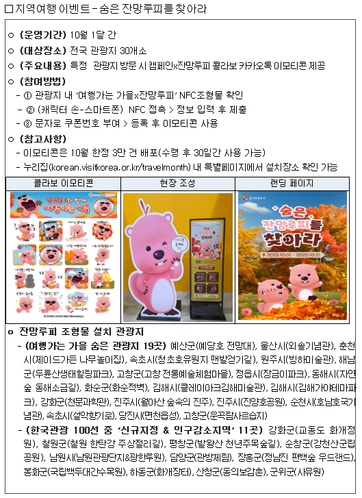 국민 캐릭터 잔망루피가 이번 캠페인에 합류하여 특별한 재미를 더합니다. 숨은 관광지 중 일부(19곳)와 '2025~2026 한국관광 100선' 중 인구감소지역 등 특정 장소를 방문하면 '여행가는 가을 x 잔망루피' 한정판 이모티콘을 받을 수 있습니다.