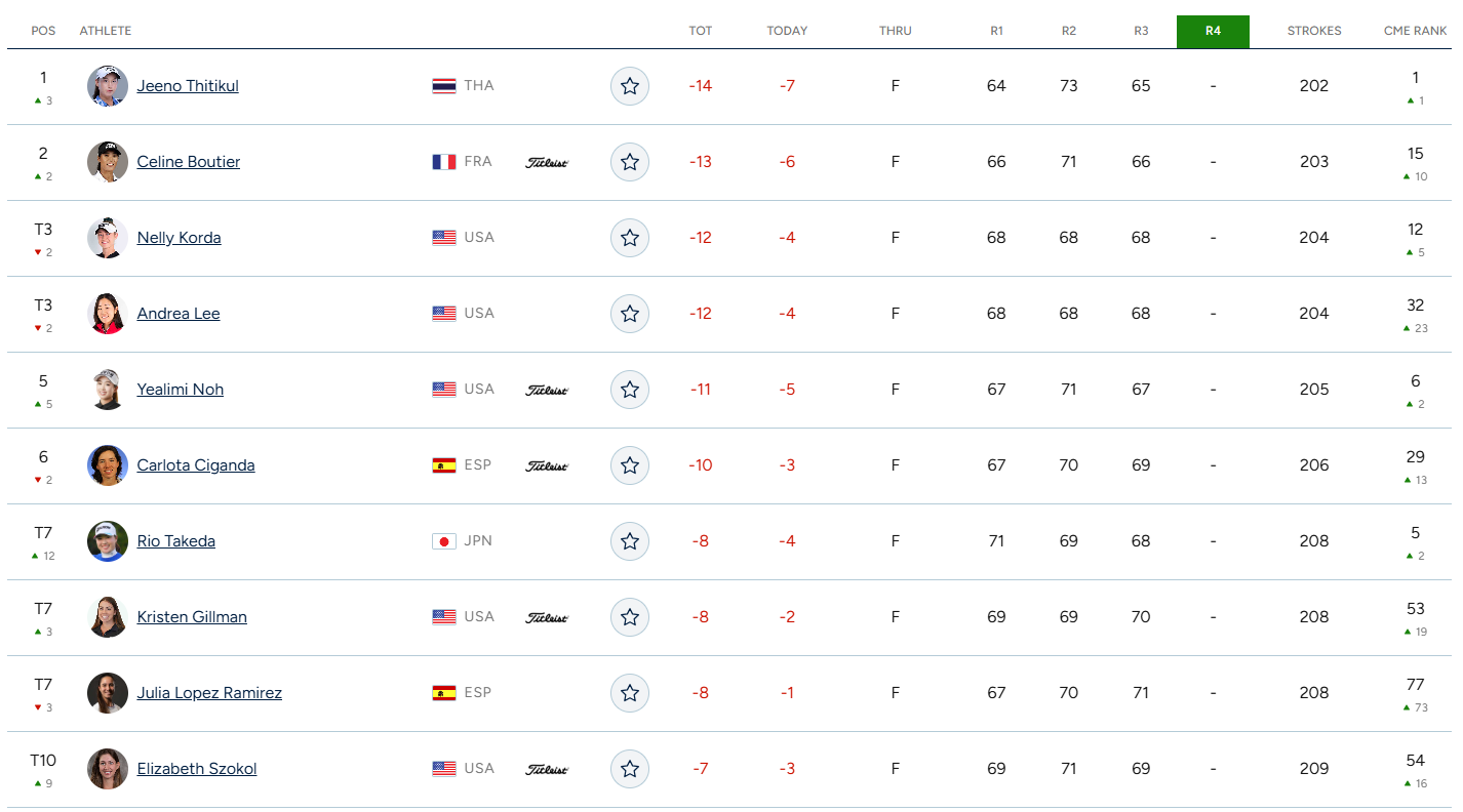 - 넬리 코다: 1번 홀에서 보기를 범했지만 이후 5개의 버디를 추가하며 4언더파 68타를 기록, 중간 합계 12언더파로 공동 3위에 자리했습니다.