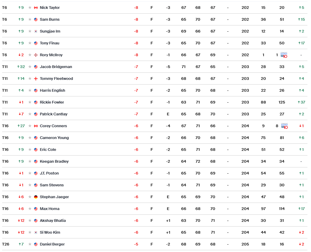 - 공동 6위 선수들: 임성재와 함께 닉 테일러, 토니 피나우, 로리 매킬로이, 샘 번스가 중간 합계 8언더파로 공동 6위에 올라 있습니다.