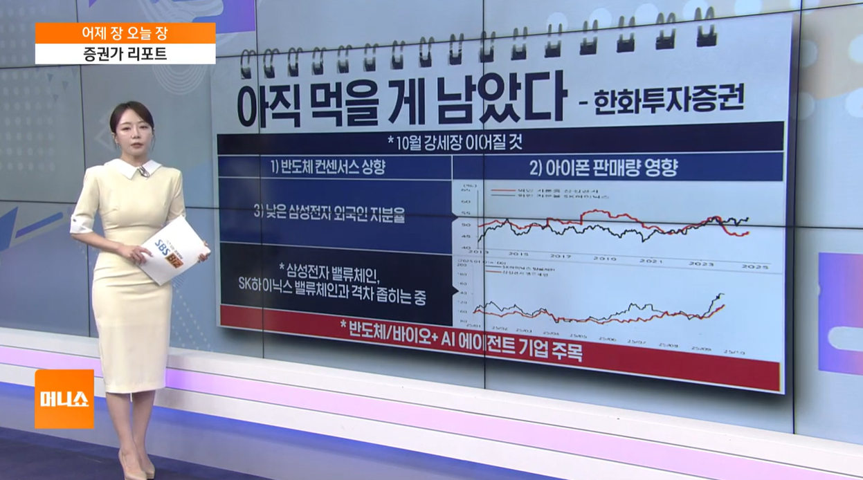 • 증권가 10월 전망: 한화투자증권은 10월에도 강세장을 예상했습니다. 반도체 컨센서스 상향, 애플 아이폰 판매량 양호, 삼성전자 외국인 지분율 추가 매수 여력 등을 이유로 들었습니다. 특히 연말까지 반도체, 바이오, 소프트웨어 업종이 긍정적일 것으로 판단했으며, 소프트웨어는 아직 시작도 안 했다며 AI 에이전트 기업들의 주목을 내다봤습니다.