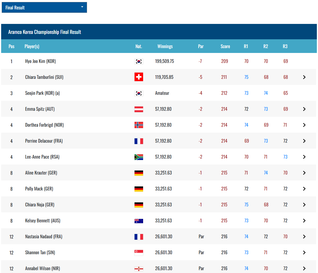 김효주 선수가 2025년 아람코 코리아 챔피언십에서 2년 연속 우승을 차지하며, 유럽여자프로골프투어(LET) 통산 3승을 기록했습니다. 이번 대회는 경기도 고양시 뉴코리아 컨트리클럽(파72)에서 개최되었으며, 김효주는 최종 합계 7언더파 209타로 스위스의 키아라 탐불리니를 2타 차로 제치고 우승을 확정 지었습니다. 김효주는 대회 마지막 날 버디 4개와 보기 1개를 기록하며 3언더파 69타를 쳤습니다. 특히 후반 11번 홀(파3)에서 버디를 잡아 흐름을 되찾았고, 13번 홀(파5)과 17번 홀(파5)에서도 버디를 추가하며 선두 자리를 굳건히 지켰습니다.
