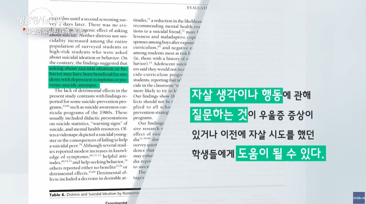 - 걱정하지 마세요: 많은 사람이 자살에 대해 질문하면 오히려 자살 충동을 유발하거나 부추길까 봐 걱정하지만, 연구 결과는 정반대입니다. 미국 뉴욕주 청소년들을 대상으로 한 연구에서, 자살 고위험군 학생들에게 자살에 대해 질문했더니 오히려 우울증이 감소하고 자살 생각도 감소하는 것으로 나타났습니다.