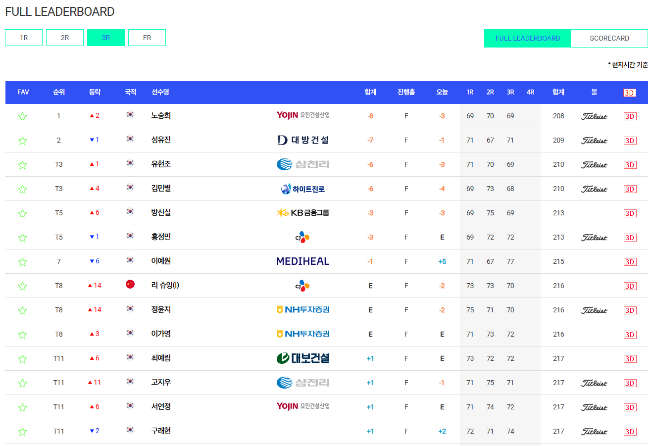 대회 3라운드가 마무리된 현재, 리더보드는 한 치의 양보 없는 긴장감을 보여주고 있습니다. 특히, 올 시즌 최고의 활약을 펼치고 있는 선수들이 우승권에 집중 배치되면서 최종일 드라마를 예고했습니다.