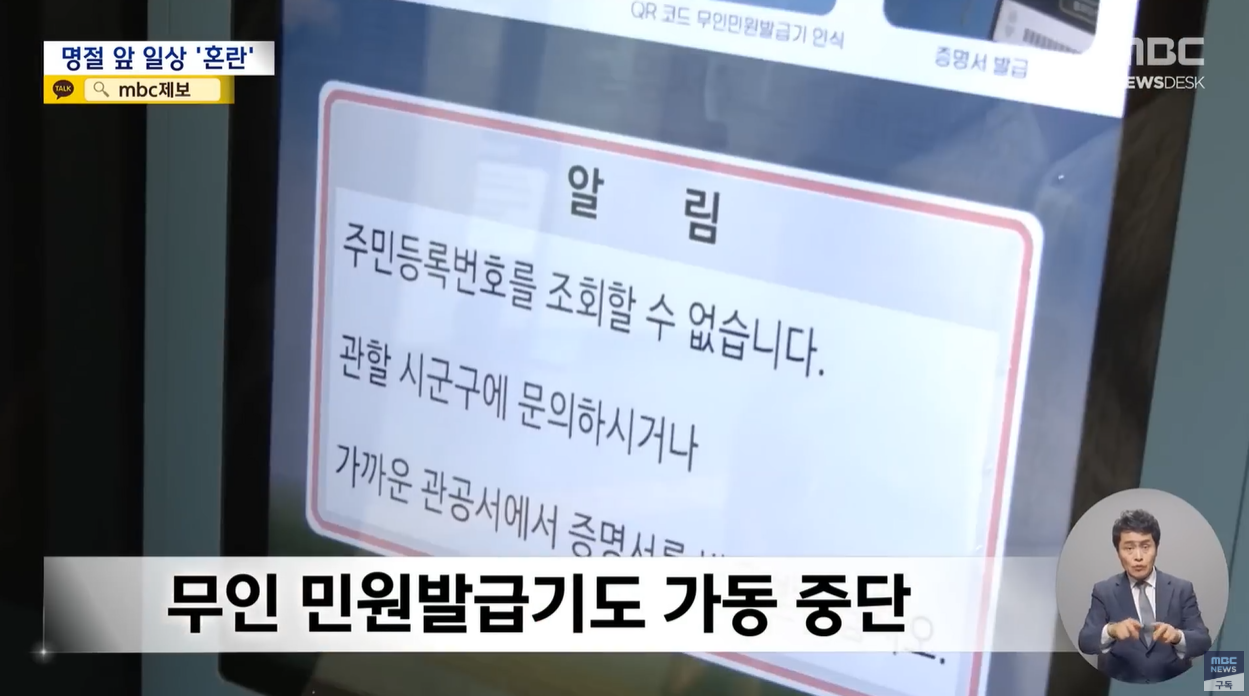 • 무인 민원 발급기 셧다운: 주민등록등본, 납세 증명 등 수십 종의 중요 증명서를 출력할 수 있는 전국의 무인 민원 발급기가 하루아침에 '고철덩어리'가 되었습니다. 서류를 급하게 떼야 하는 민원인들은 큰 불편을 겪었습니다.