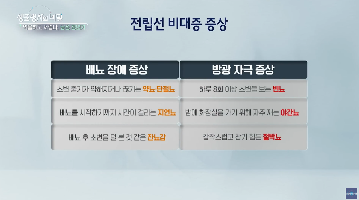 남성 호르몬 감소는 전립선 비대증에도 영향을 미칩니다. 비대해진 전립선은 요도를 눌러 빈뇨나 잔뇨감 같은 배뇨 장애를 유발하며, 이 역시 갱년기 증상과 맞물려 삶의 질을 크게 떨어뜨립니다.