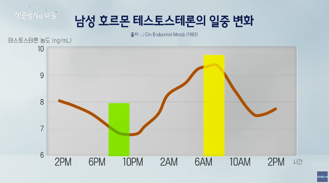 • 테스토스테론 피크 타임: 남성 호르몬은 늦은 오후에 가장 낮고, 아침 6시~8시 사이에 가장 높게 분비됩니다. 이 흐름에 맞춰 밤에 충분한 숙면을 취해야 호르몬이 충분히 생성될 수 있습니다.