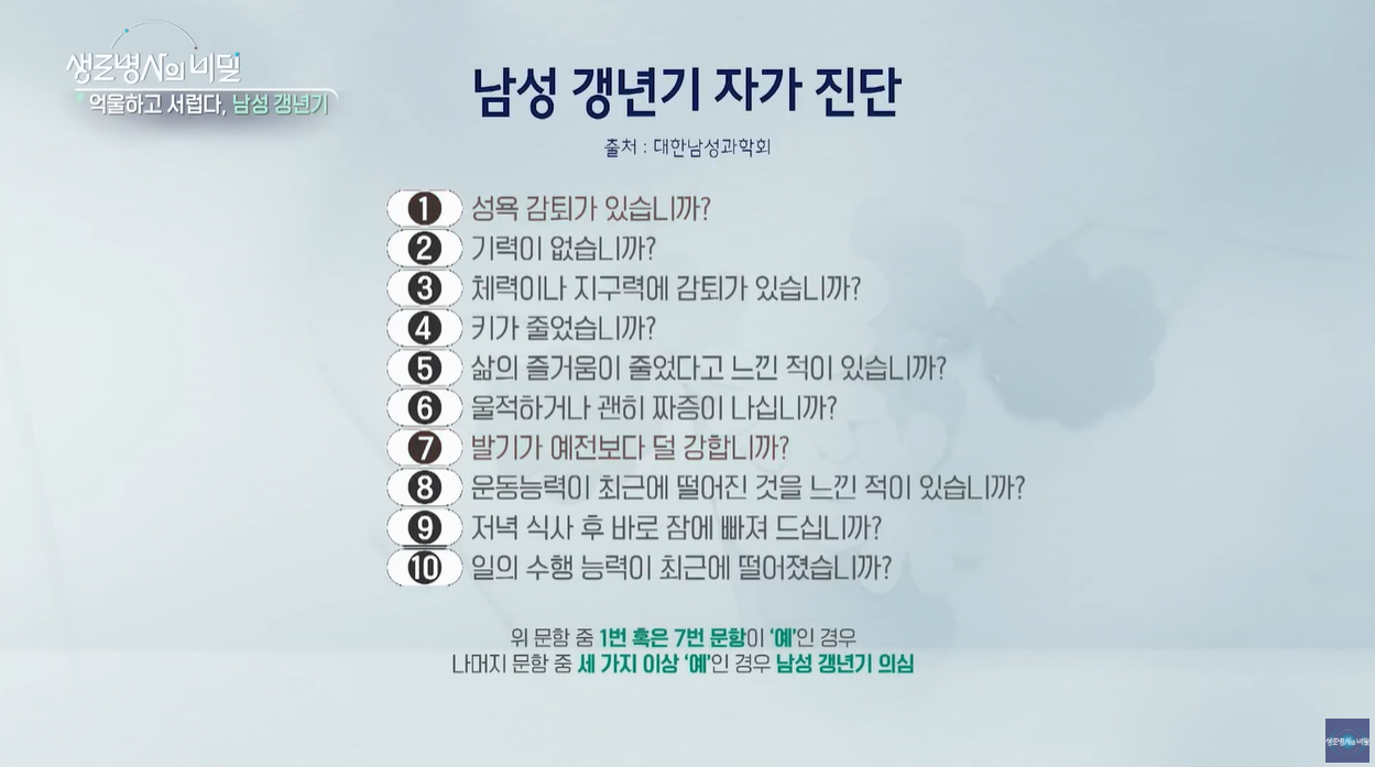 다음 자가 진단 항목 중 1번이나 7번 문항에 해당하거나, 나머지 문항 중 세 개 이상에 체크했다면 남성 갱년기를 의심하고 전문적인 검사를 받아보시는 것이 좋습니다.