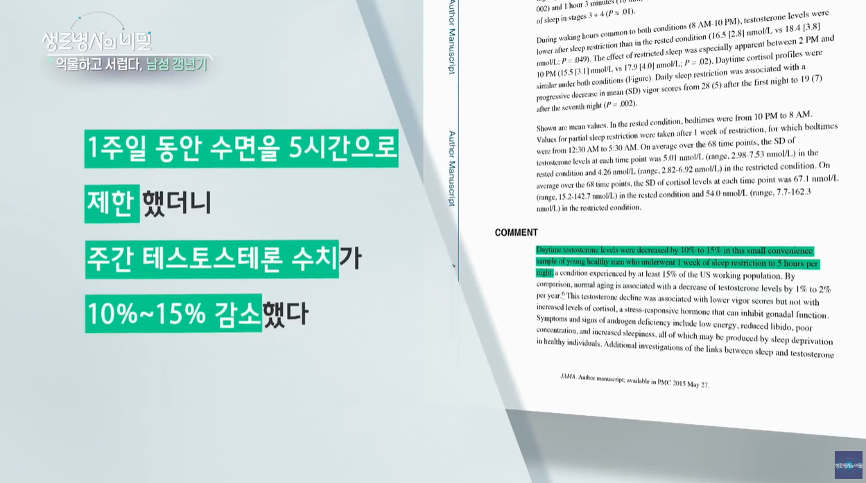 - 수면 부족의 위험성: 일주일 동안 5시간으로 수면을 제한했더니 테스토스테론 수치가 최대 15%까지 급격히 하락했다는 연구 결과가 있습니다. 수면 부족은 스트레스 호르몬인 코르티솔을 증가시켜 호르몬 분비를 돕는 LH 호르몬의 분비를 저하시키기 때문입니다.