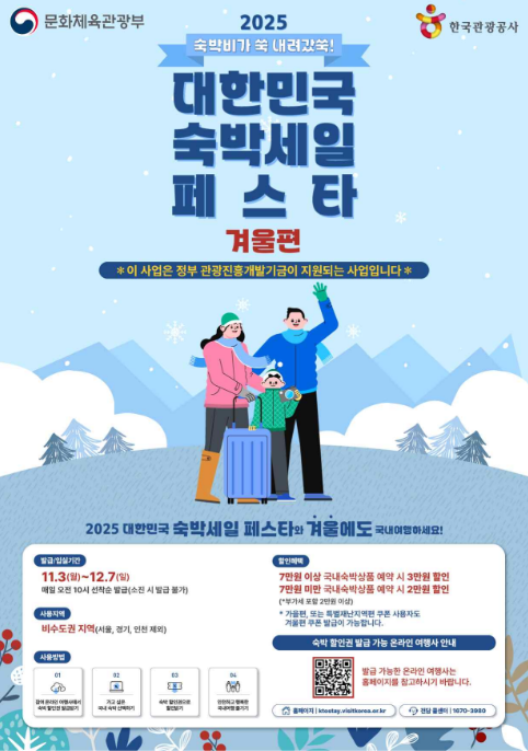 문화체육관광부와 한국관광공사가 주관하는 '2025년 하반기 숙박세일페스타 겨울편'이 드디어 시작됩니다.