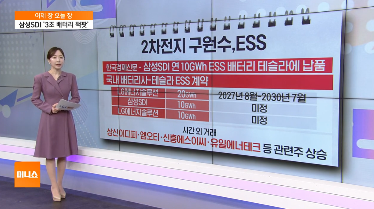- 삼성 SDI의 쾌거: 한국경제신문 보도에 따르면, 삼성 SDI가 미국 테슬라에 3조 원이 넘는 에너지 저장 장치(ESS)용 배터리를 3년에 걸쳐 공급한다는 소식이 전해졌습니다.