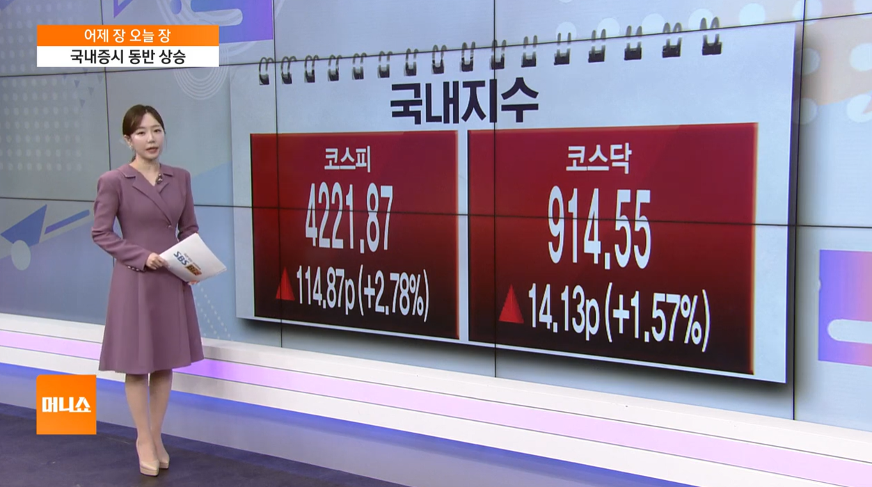 - 코스피 마감: 전일 대비 2.8% 급등하며 4,221선에 마감.