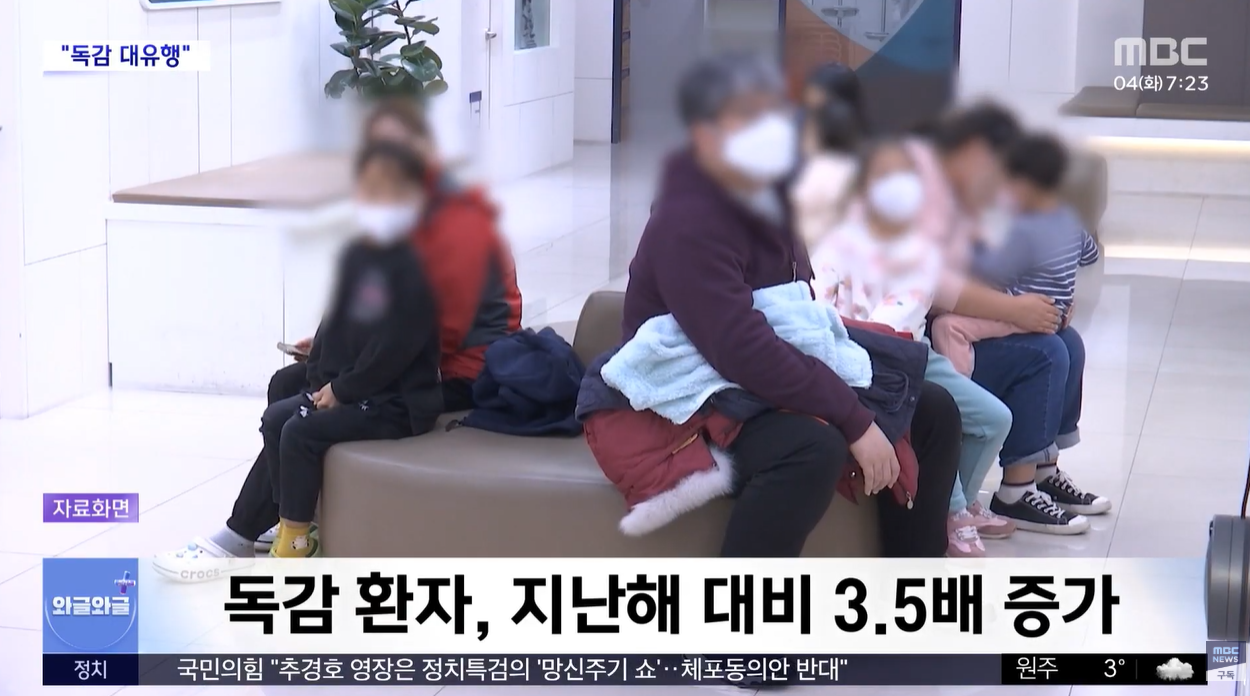 - 환자 급증 확인: 지난달 말, 38도 이상 발열과 기침 등의 증상으로 병원을 찾은 환자 수를 표본 감시한 결과, 인플루엔자 독감 환자 발생이 지난해 같은 기간 대비 3.5배에서 최대 5배나 많은 것으로 파악되었습니다.