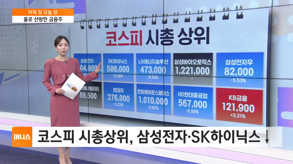 이외에도 현대차, 한화에어로스페이스, HD 현대중공업 등 주요 대형주들이 일제히 하락했습니다. 다만, KB금융이 3% 넘게 상승하며 시가총액 10위권에 안착하는 등 일부 금융주가 강세를 보이며 방어하는 모습도 포착되었습니다.