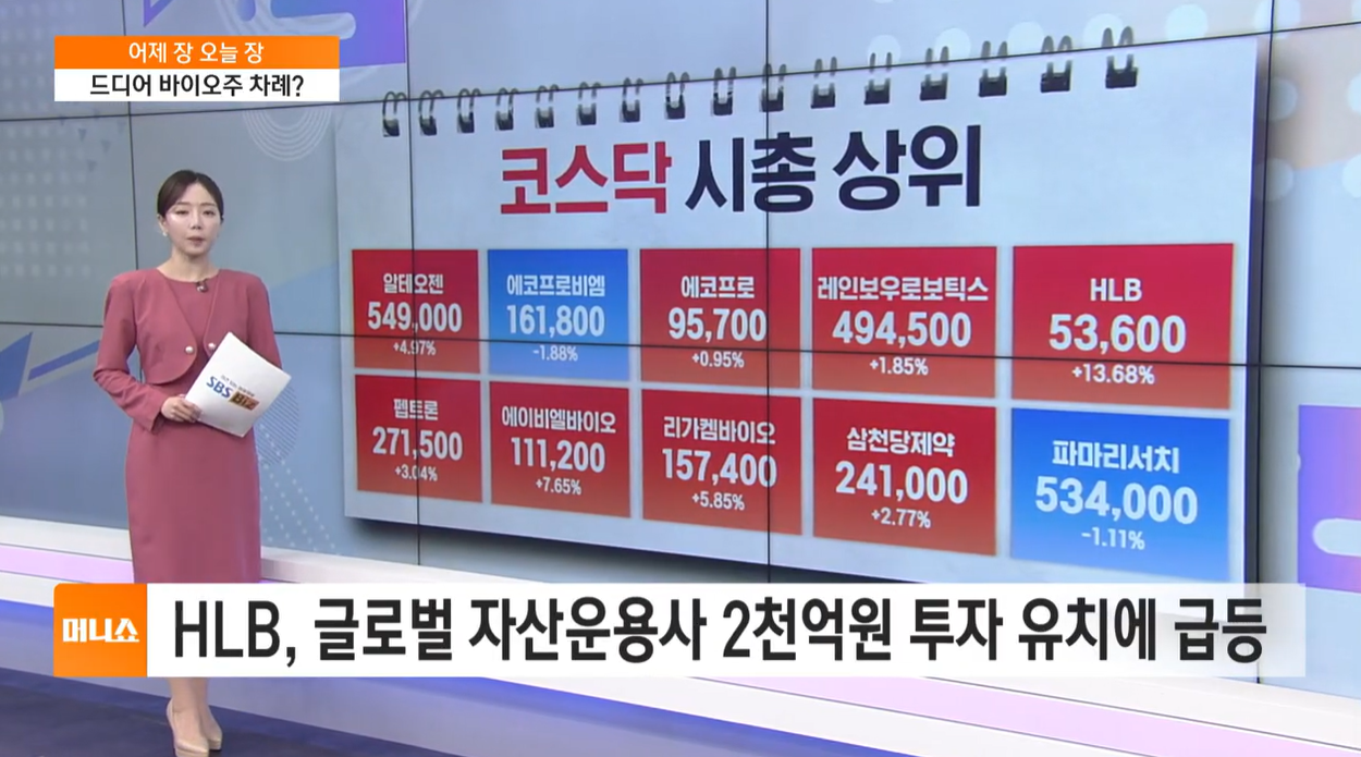 코스닥 시장의 분위기는 완전히 달랐습니다. 에코프로비엠과 파마리서치를 제외한 나머지 시총 상위 8개 종목이 일제히 상승하며 강한 면모를 과시했습니다. 이 중에서도 특히 눈에 띄는 종목은 시가총액 5위에 오른 HLB였습니다.