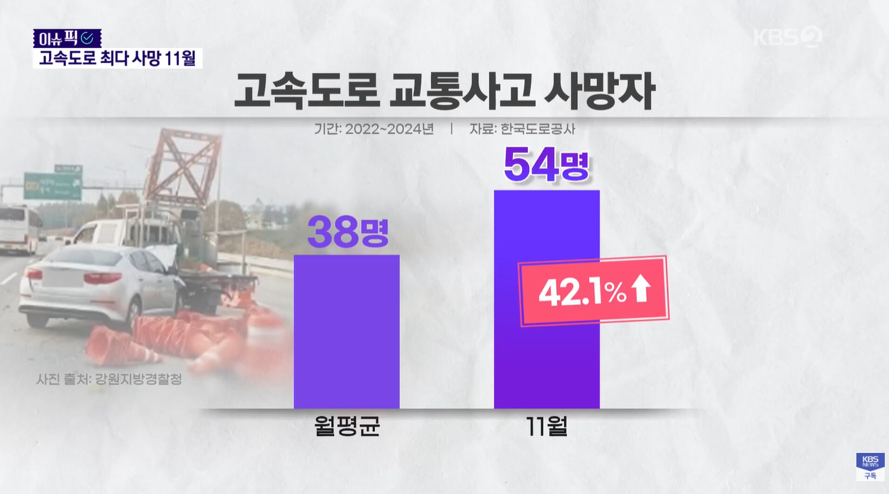 • 최다 사망 사고 발생: 최근 3년간 고속도로 교통사고 사망자는 11월에만 54명으로 집계되었습니다. 이는 다른 달 평균 사망자 수보다 40% 이상 많은 수치입니다.
