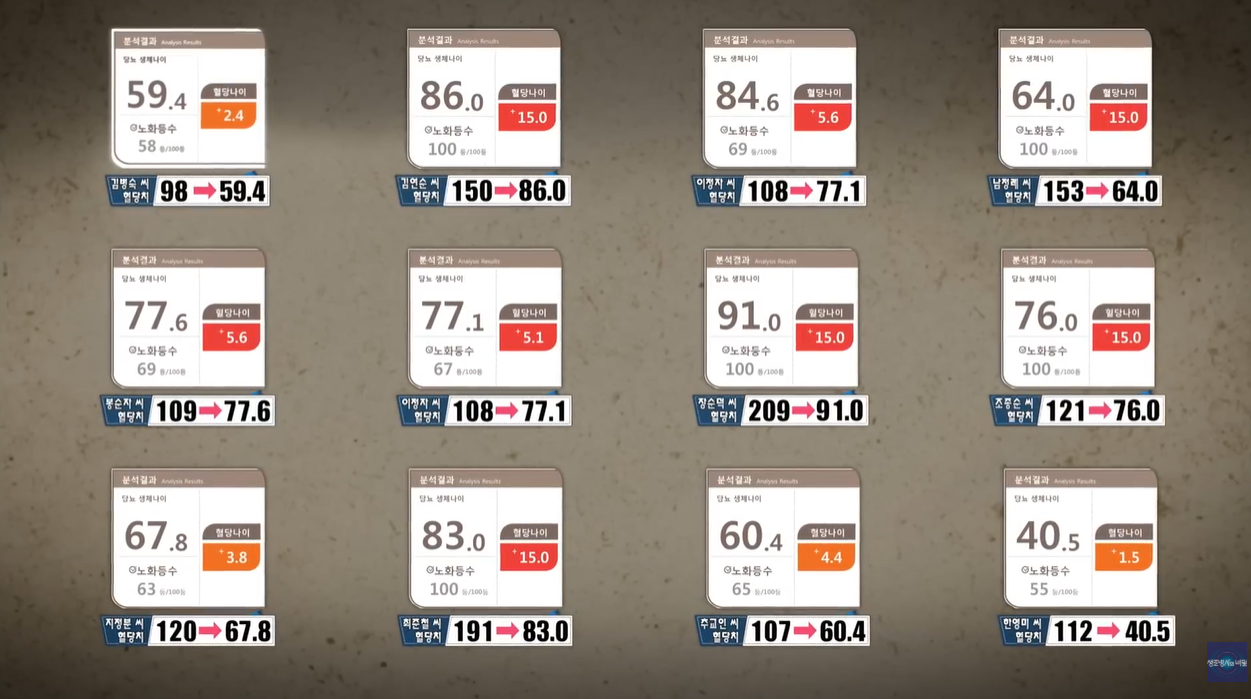 연령, 키, 몸무게, 당뇨 유병 기간 등을 고려해 계산한 '혈당 나이' 측정 결과, 장순덕, 김연순, 조종순 세 분이 실제 나이보다 무려 플러스 15세라는 가장 많은 추가 나이를 기록했습니다. 이는 이분들의 몸 내부가 실제보다 15년 더 빠르게 노화되고 있음을 의미하는 충격적인 결과입니다.