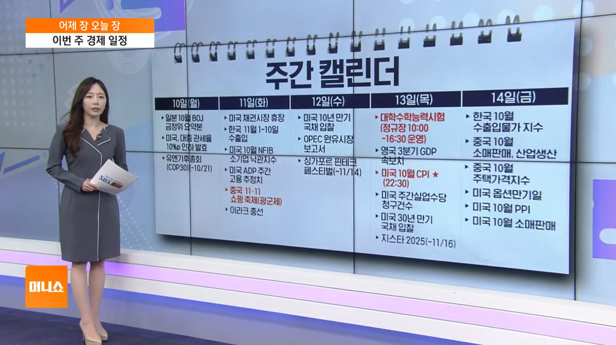 - CPI 발표: 13일(현지시간)에 예정된 미국 10월 소비자물가지수(CPI) 발표가 예정대로 이루어질지가 핵심입니다. 셧다운이 지속되면 발표 일정 자체에 변동이 생길 수 있으므로, 인플레이션 압력 확인과 셧다운 지속 여부를 함께 체크해야 합니다.