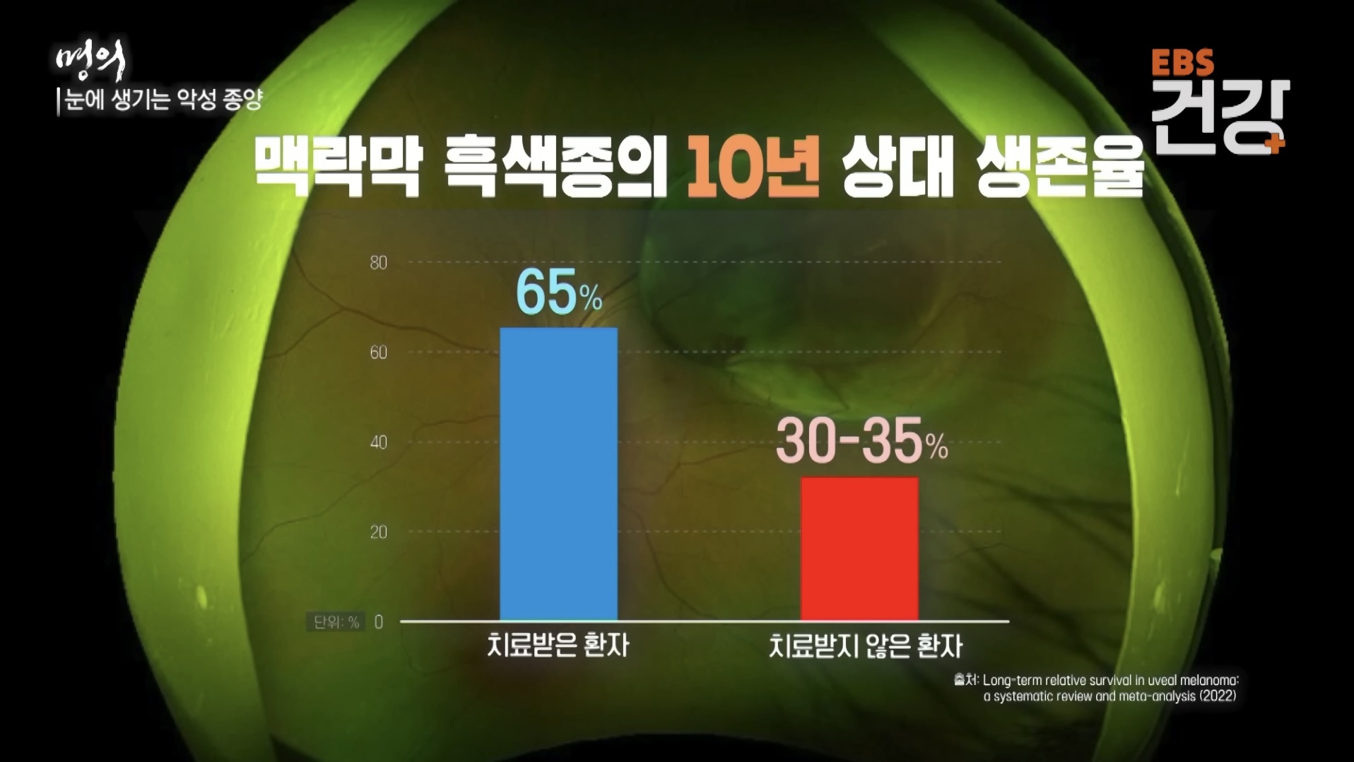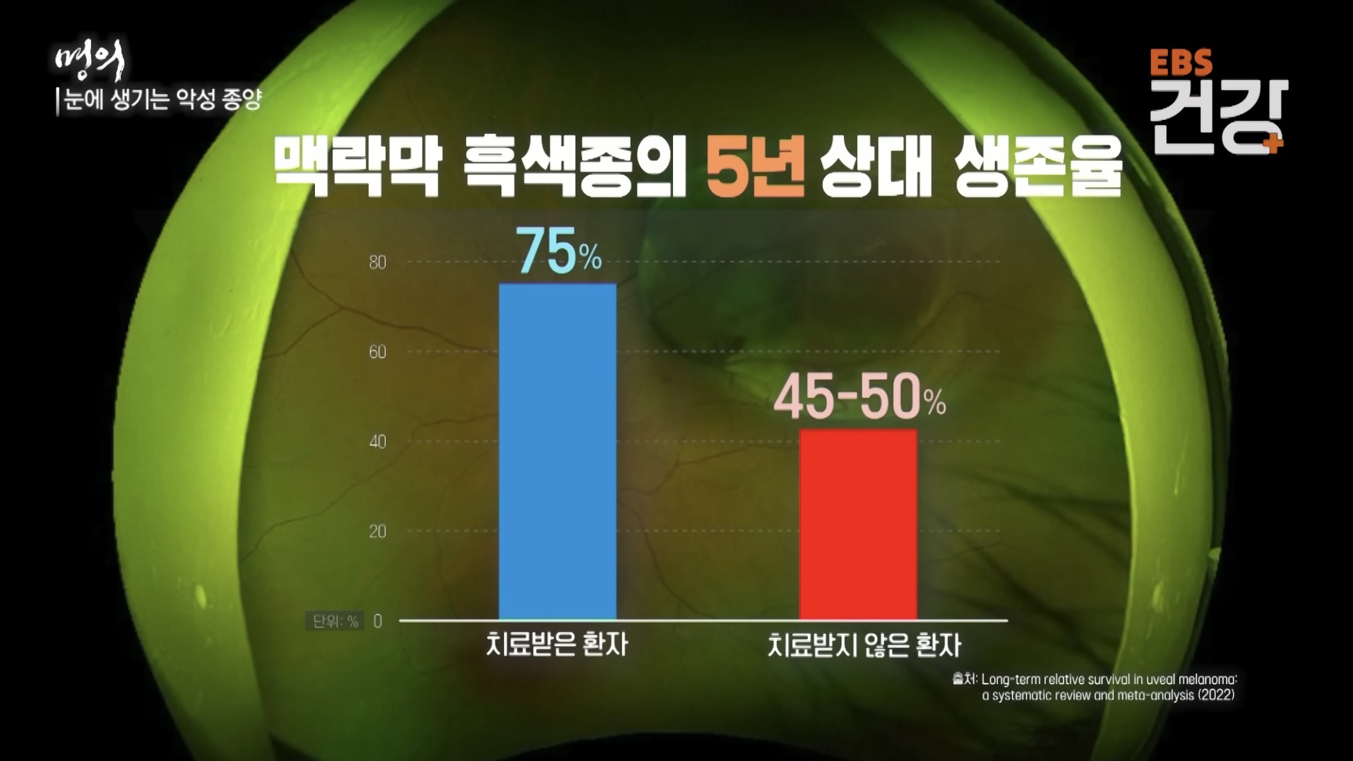 - 생존율: 맥락막 흑색종 환자의 경우, 치료받지 않으면 5년 내에 5명 중 2명은 생명을 잃을 만큼 예후가 좋지 않은 치명적인 암입니다.