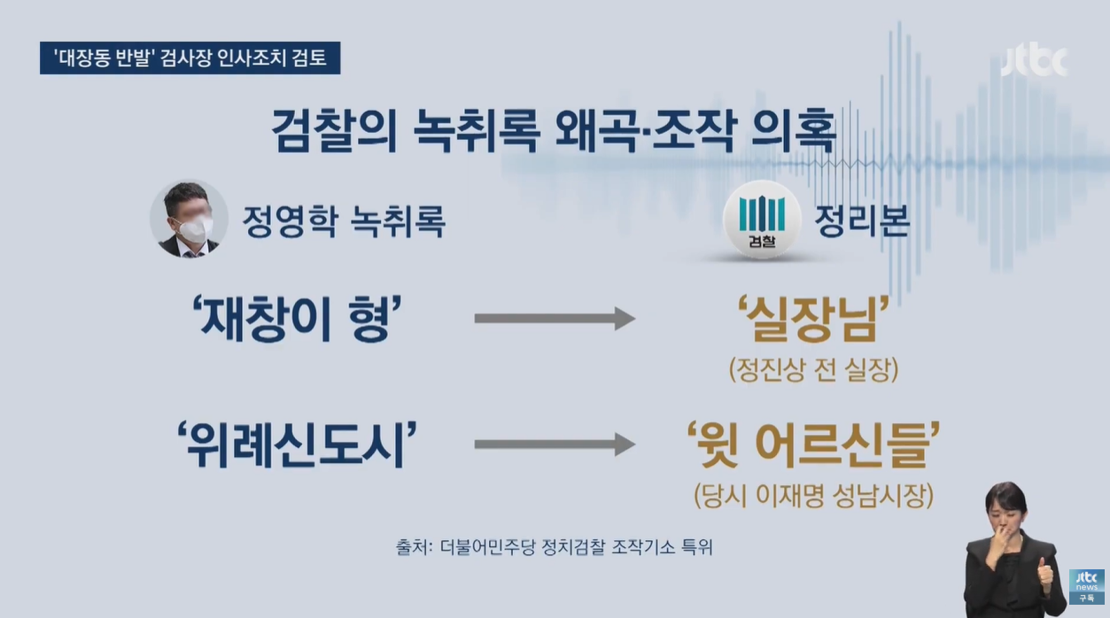 - 녹취록 왜곡 의혹: 대장동 개발자 정영학 씨의 녹취록 일부 단어를 검찰이 의도적으로 왜곡했다는 의혹을 제기했습니다.