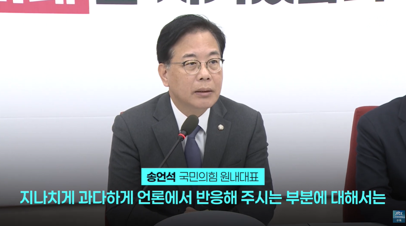 - 언론 비판: 송언석 의원은 "당에 있었던 일을 가지고 지나치게 과다하게 언론에서 반응해 주시는 부분에 대해서는"이라고 말하며 언론의 보도 태도를 정면으로 비판했습니다.