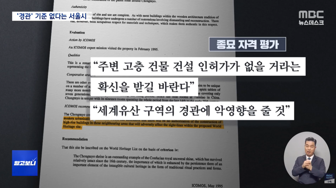 - 주장 2: 경관과 등재의 무관성 강조: 이 논리를 확장하여, 마치 종묘의 세계유산 등재와 경관 보호는 아무런 관계가 없는 것처럼 언급하며, 고층 건물 건설이 등재 취소의 요인이 될 수 없음을 주장했습니다.
