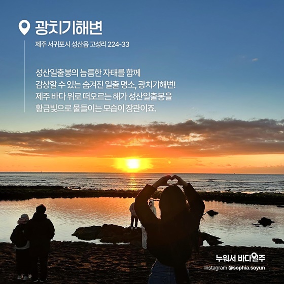 - 핵심 매력: 성산일출봉의 늠름한 자태를 가장 아름다운 구도에서 함께 감상할 수 있는 숨겨진 일출 명소입니다. 일출봉 근처의 혼잡함을 피해 조용히 해를 맞이하기 좋습니다.