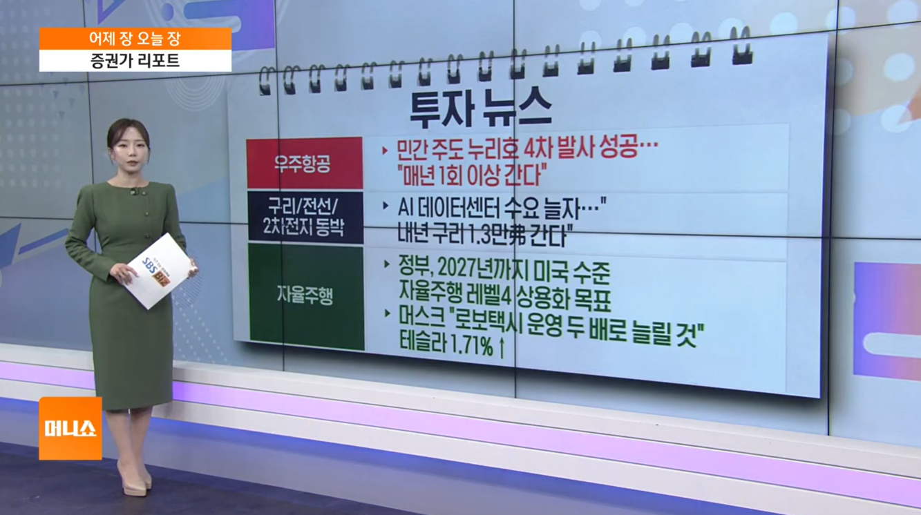 - 테슬라 모멘텀: 간밤 뉴욕 증시에서 테슬라가 로보택시 운영을 두 배로 늘릴 것이라고 밝히며 주가가 2% 가까이 뛰어, 국내 증시의 자율 주행 관련주도 주목받을 것입니다.