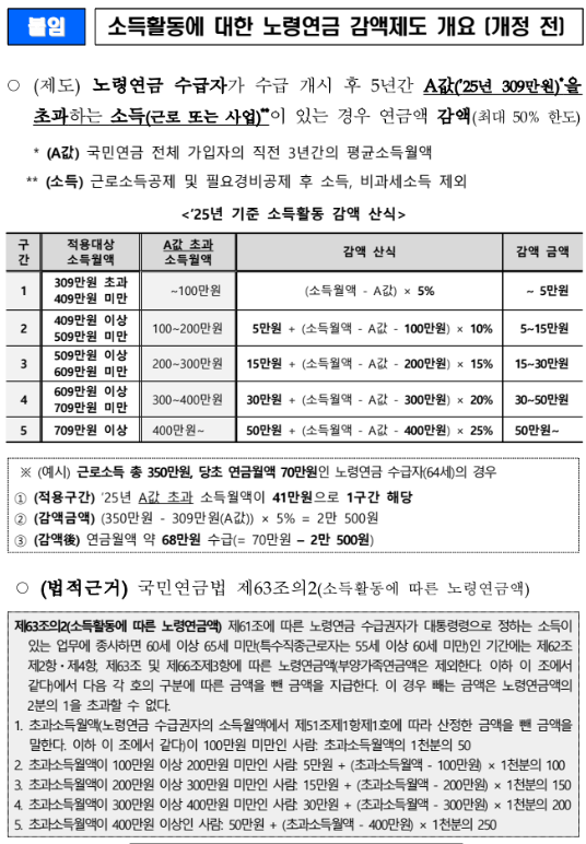 - 감액 제외 기준: 전체 가입자 평균 소득월액(A값)을 초과하는 근로·사업 소득이 200만 원 미만인 경우, 연금 감액을 적용하지 않도록 했습니다.