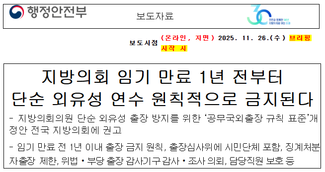 ✈️ 외유성 출장 OUT! 지방의원 임기 1년 전부터 국외 출장 원천 금지: 행안부, 위반 시 '재정 페널티' 초강수
