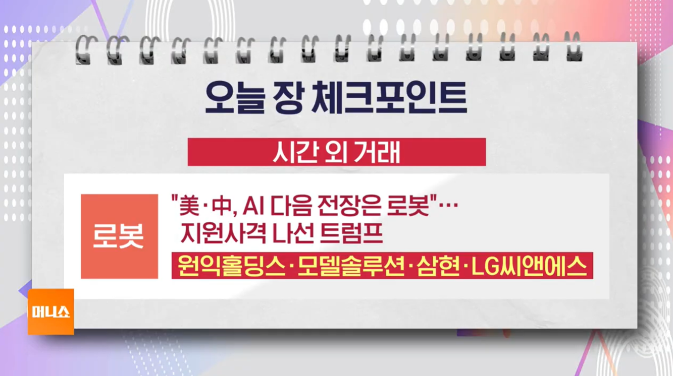 - 미국 로봇 산업 투자 기대감: 시간외 거래에서도 로봇주의 상승세는 계속 이어졌는데, 이는 미국의 로봇 산업 투자 속도가 빨라질 것이라는 기대감이 반영된 결과입니다.