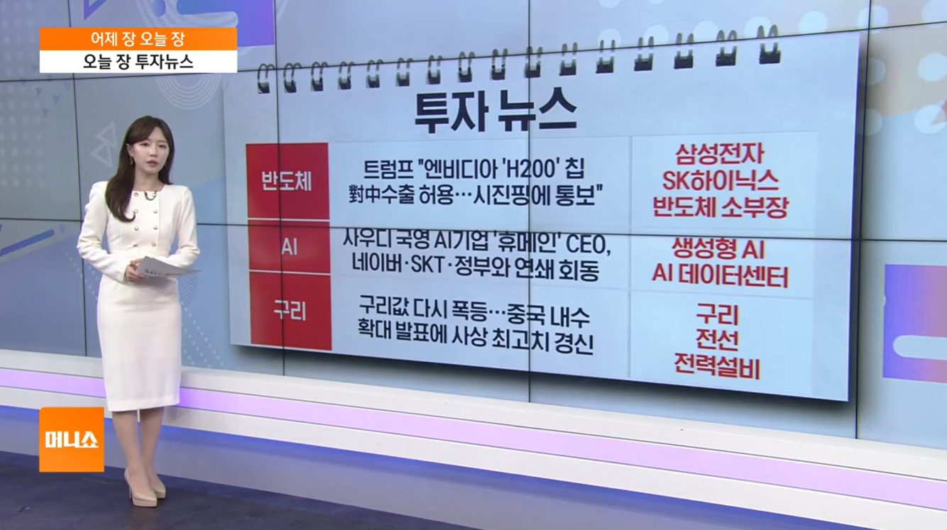 - AI 데이터센터 협력: 사우디 국영 AI 기업 '휴메인'의 CEO가 오늘 방한합니다. 휴메인은 xAI 및 엔비디아와 함께 500MW급 초대형 AI 데이터 센터 프로젝트를 추진할 계획을 공개한 바 있습니다.