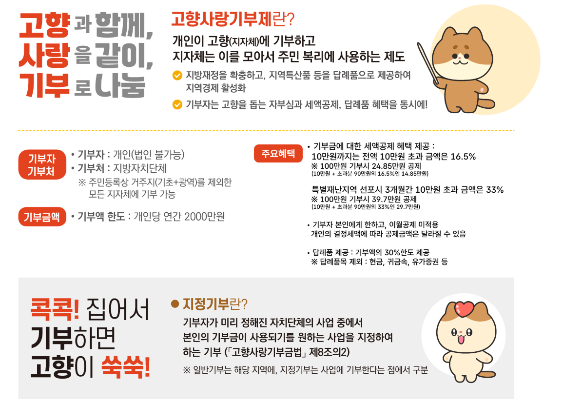 - 기부자: 기부의 뿌듯함과 더불어 세금 절약 혜택 및 지역 특산품을 받아 실질적인 혜택을 누릴 수 있습니다.