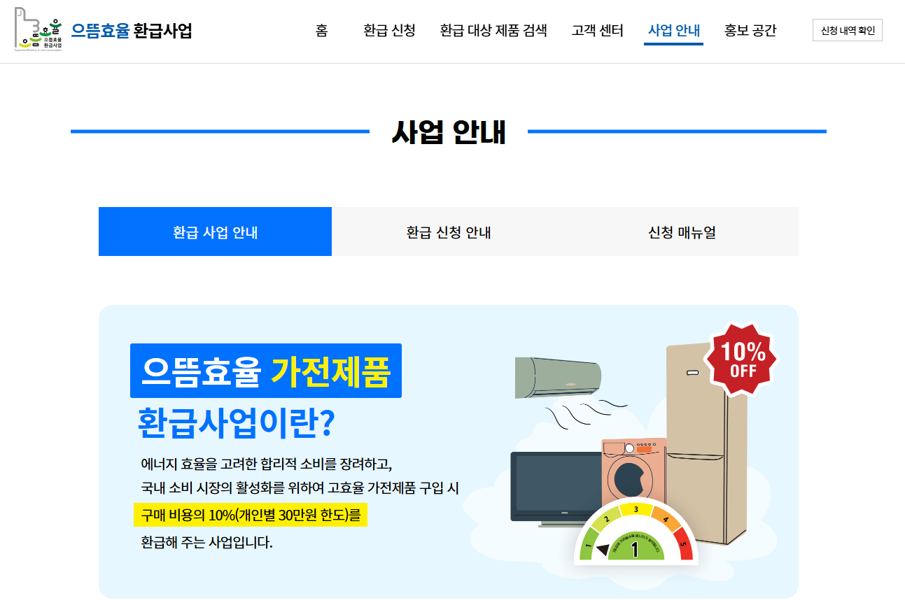 | 혜택 | 최상위 에너지 효율 등급 가전제품 구매 시 구매비용의 10% 환급 |