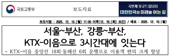 윤진환 국토부 철도국장은 "이번 KTX-이음 투입으로 잠재력이 풍부한 경북, 강원 지역과 부산·울산, 수도권 간의 연결이 더욱 견고해질 것"이라고 강조했습니다.