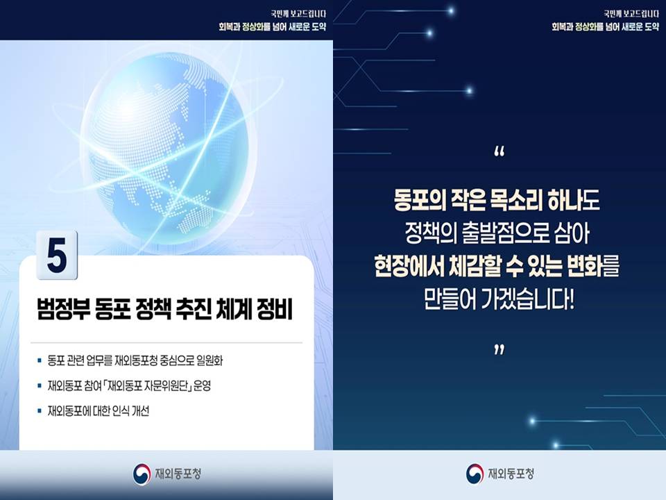 700만 재외동포 여러분, 대한민국은 언제나 여러분의 든든한 울타리가 되겠습니다. 새로운 도약을 시작하는 이번 정책들이 여러분의 삶에 실질적인 변화로 다가가길 진심으로 기원합니다!