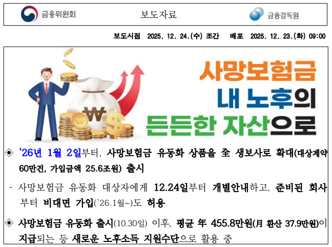 그동안 삼성, 한화 등 5개 대형 보험사에서만 시범적으로 운영되던 사망보험금 유동화 서비스가 내년(2026년) 1월 2일부터는 국내 19개 전체 생명보험사에서 만나볼 수 있게 됩니다. 🏛️