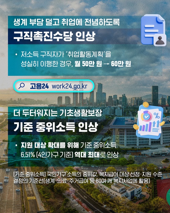 - 내용: 본인이 세운 '취업활동계획'을 성실히 이행하는 저소득 구직자에게 지급되는 수당이 월 50만 원에서 월 60만 원으로 인상되었습니다.