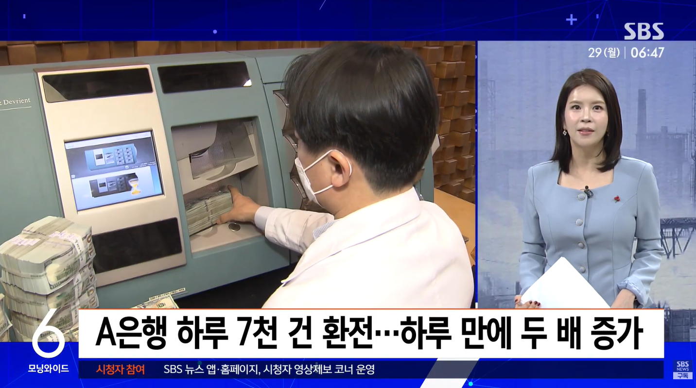 - 환전 전쟁: 지난 24일 외환당국 개입으로 환율이 30원 넘게 떨어진 날, 강남의 한 은행에서는 100달러 지폐가 동날 정도였습니다.
