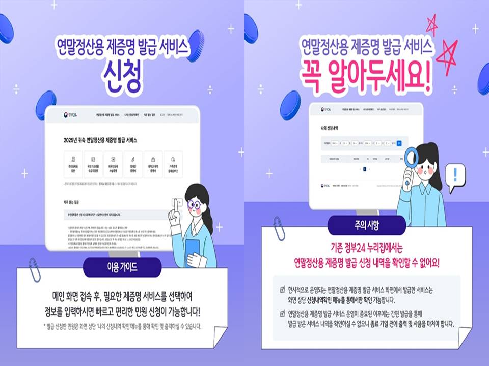 - 신청내역 확인 주의: 이번에 운영되는 연말정산용 전용 화면에서 신청한 내역은 기존 정부24 홈페이지에서는 확인이 불가능합니다! 반드시 전용 화면 상단의 신청내역 메뉴를 이용해야 합니다.
