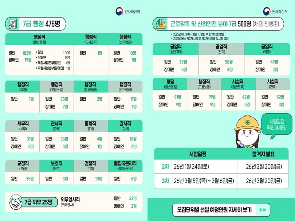 - 추가 채용: 근로감독 및 산업안전 분야 500명이 별도로 진행 중입니다. [7급 특이사항]