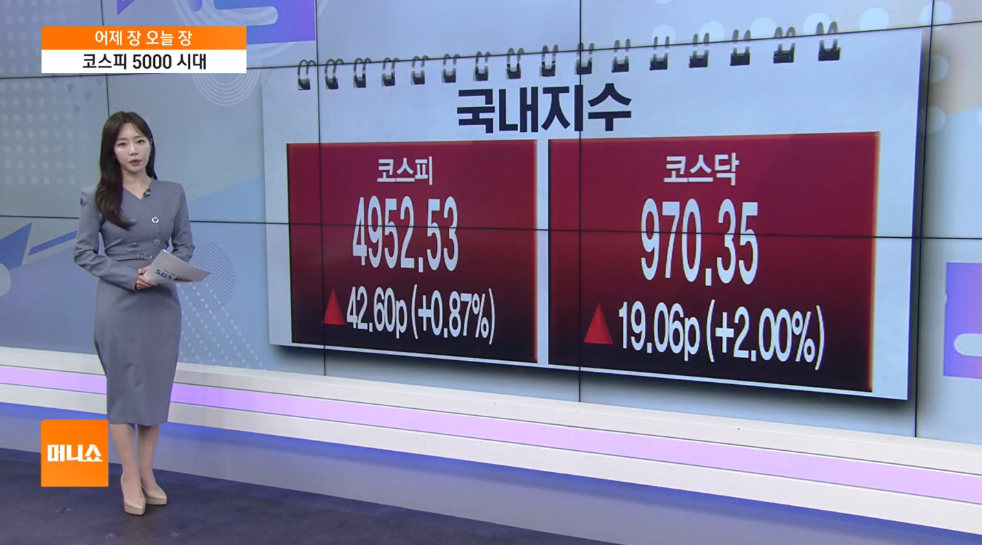 - 코스피(KOSPI): 장중 5,000포인트를 돌파하며 환호성을 자아냈습니다. 비록 오후 들어 차익 실현 매물이 나오며 5,000선 아래에서 장을 마감했지만, 종가 기준 4,952.53포인트를 기록하며 역대 최고치를 갈아치웠습니다.