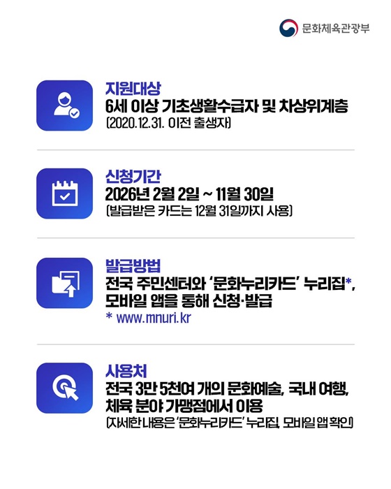 - 지원 목적: 경제적 여건과 상관없이 모든 국민이 풍성한 문화생활을 누릴 수 있도록 국가가 챙겨드립니다.